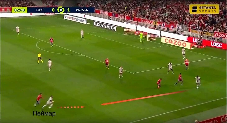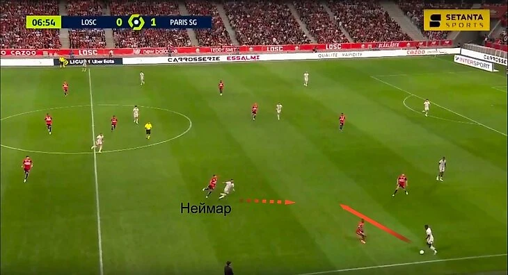 Пожалуй, ярче всего было заметно против «Лилля» (7:1), который стабильно высоко душил «ПСЖ» давлением. Спуск Неймара к левому латералю Нуну Мендешу – один из постоянных вариантов выхода из защиты в атаку. На плечах бразильца висел кусачий опорник Бенжамен Андре. Можно подытожить их локальный поединок ничьей: и Андре несколько раз жестко вернул мяч с остановками Неймара, и Неймар быстрым перепасом с Мендешем организовал пару опасных быстрых выпадов.