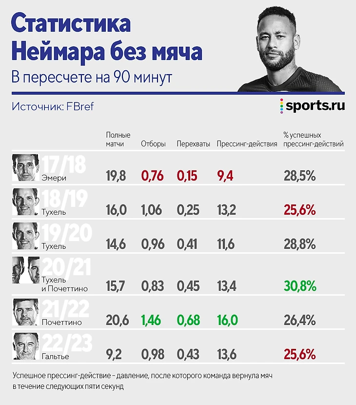 Может удивить, что статистика оборонительных действий Неймара в этом сезоне не особо выделяется на фоне других кампаний за «ПСЖ». Почти все лучшие показатели бразилец собрал в сезоне-2021/22.