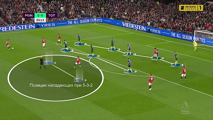Чтобы понять эту ставку, важно знать, как организован этот «Тоттенхэм». На практике схема команды часто выглядит как 5-3-0-2 – есть разрыв в конкретной зоне, просто так не принято записывать. В обычных 5-3-2 в таких эпизодах нападающие оказывались бы в кадре и помогали бы держать компактность: