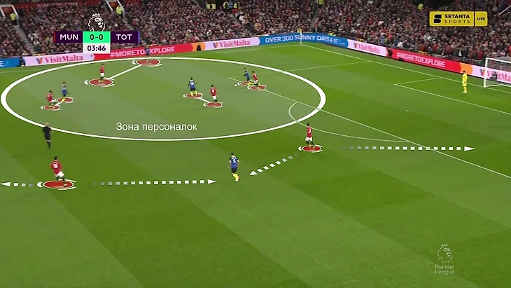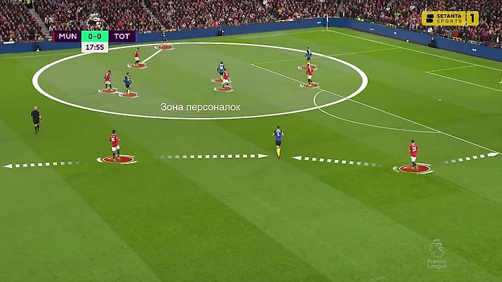 «Юнайтед» использовал типичную структуру прессинга – в зоне мяча четкие персональные ориентировки, а на дальней стороне тоже ориентировки, но более свободные (с возможностью читать эпизод и переключаться).
