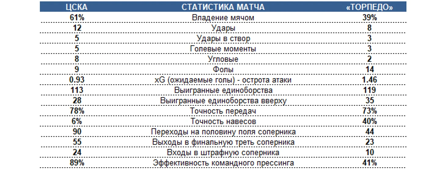 У ЦСКА, естественно, были шансы исправить ситуацию, но несколькими классными сэйвами отметился голкипер торпедовцев Александр Довбня. А забитый красно-синими ещё в первом тайме гол не был засчитан по новым трактовкам положения «вне игры», действующим с этого сезона. Раньше, когда мяч прилетал к атакующему от какой-то части тела обороняющегося, офсайд не фиксировался, даже если в момент паса от своего партнёра он находился в положении «вне игры». Касание мяча обороняющимся автоматически переводило атакующего в правильное положение. Но с этого сезона трактовки поменялись: одного касания мало, надо, чтобы мяч при этом полетел в том направлении, куда отправлял его обороняющийся. Только тогда «вне игры» не будет. Торпедовец же пытался вынести мяч в другом направлении. Теперь это считается не игрой в мяч, а банальным рикошетом, после которого офсайд все равно фиксируется. Вот такие тонкости…
