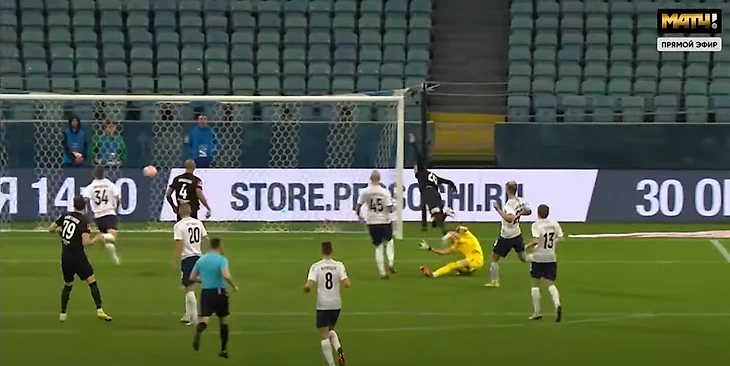 98" начало замеса. Гогличидзе и Гаджимурадов в игровой схватке возле углового флажка борются за мяч против Миладиновича и Терехова. Тот отскакивает в аут, судья показывает в пользу хозяев, но Рамазан этого не видит (или не хочет) и пытается помешать сербу продолжить игру. Иван отмахивается и попадает Гаджику по лицу. Тот падает. Реф стоит в 47 сантиметрах от событий.