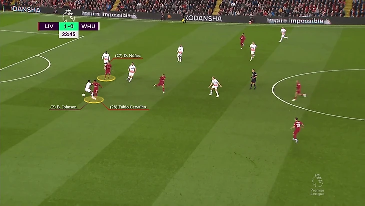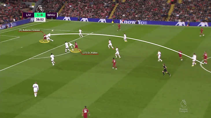 Начало этой комбинации положила интенсивная игра «Ливерпуля» без мяча. В то время как Нуньес находится в команде, чтобы забивать голы, он разделяет ответственность и за оборону. Незадолго до того, как он сдвинул дело с мертвой точки, он вернулся, помогая своей команде в обороне.