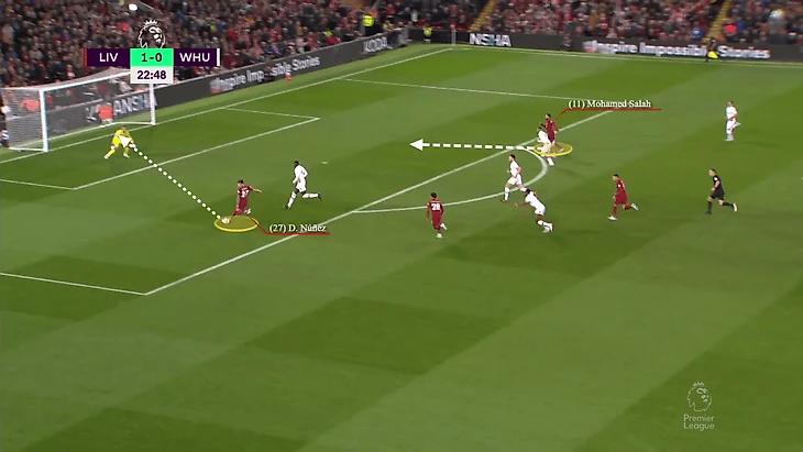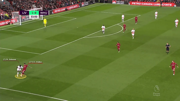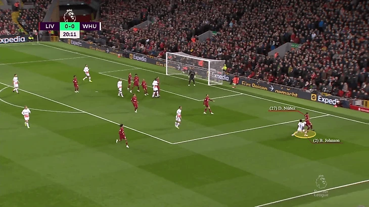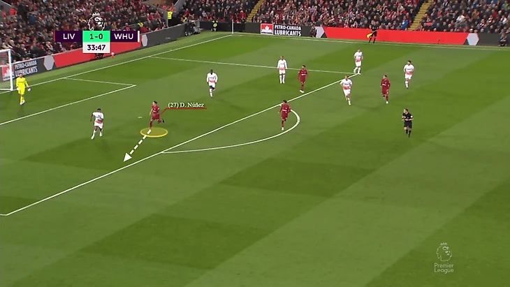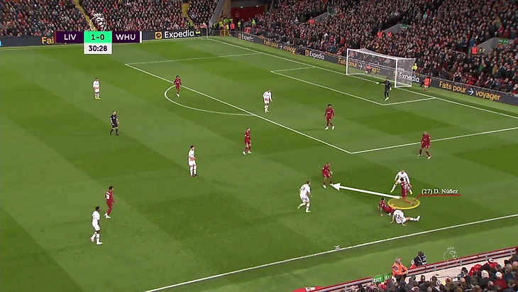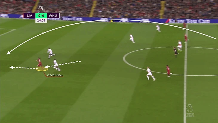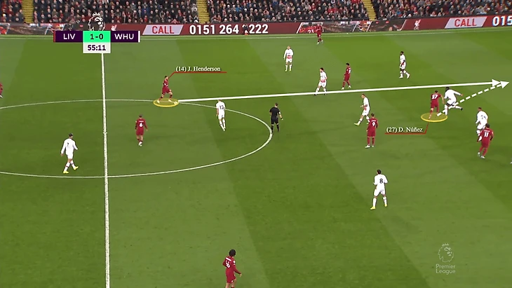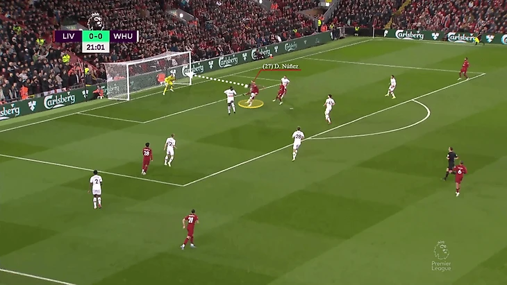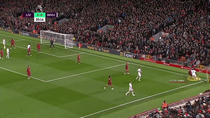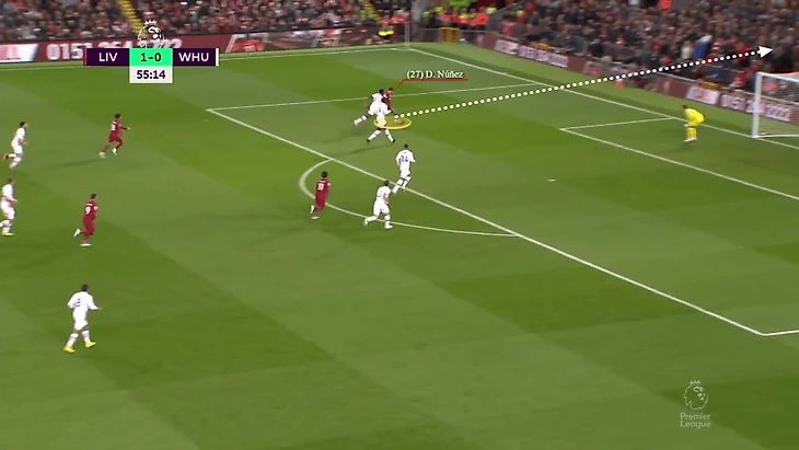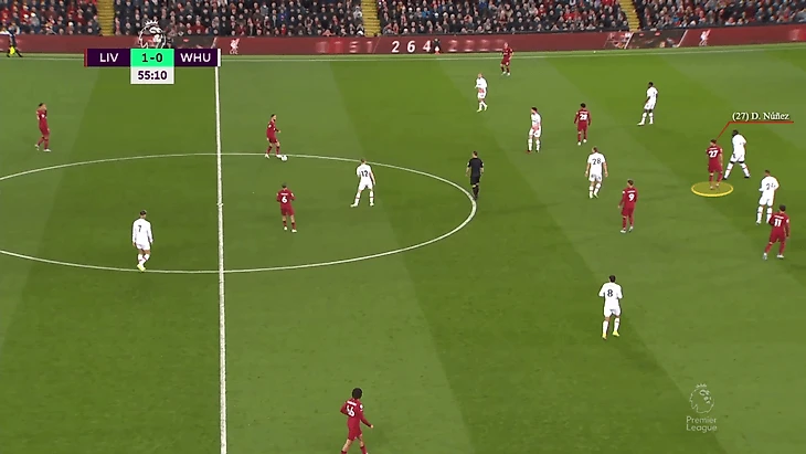 Нуньес с первых минут задавал тон и темп атаке «Ливерпуля», постоянно стремясь растянуть игру и забежать за оборону «Вест Хэма».