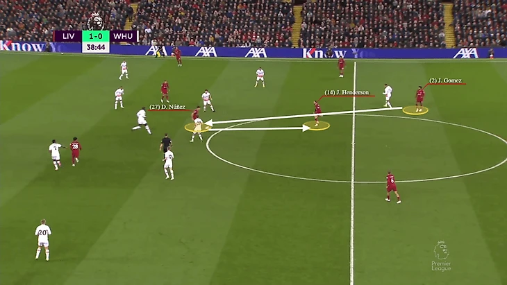 Подведение до двух ударов подряд для Нуньеса — это все, что нужно Клоппу. Сначала он связывает игру, глубоко опускаясь, чтобы получить пас от Джо Гомеса, прежде чем отдать мяч Хендерсону.