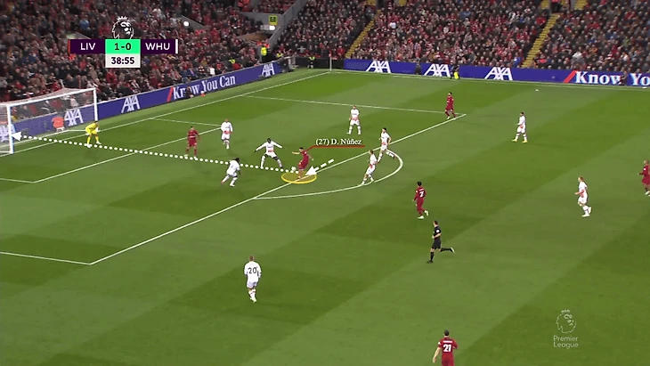 Его скорость и ускорение играют в этом огромную роль. Сообщается, что Нуньес развил максимальную скорость в 38 км/ч, что, как говорят, является самым быстрым игроком в Премьер-лиге с тех пор, как они начали вести подобные записи. Этот первый взрыв позволяет ему получить преимущество над защитниками, что проиллюстрировано его последним реальным действием в игре.