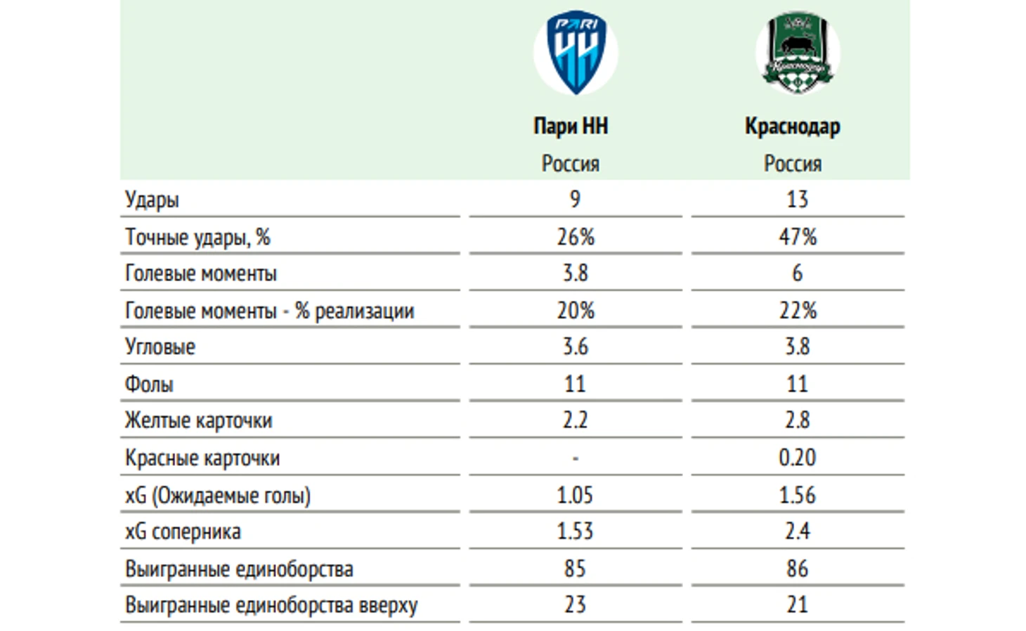 🕮 Факты: ◉ «Пари НН» проиграл на своём поле три матча подряд. ◉ На своём поле «Пари НН» пропускал во всех семи матчах и одержал в них только одну победу. ◉ «Краснодар» не может выиграть в РПЛ три тура и набрал в них только одно очко из девяти возможных. Аналогичные показатели у «быков» и в трёх последних матчах на выезде – одна ничья и два поражения.