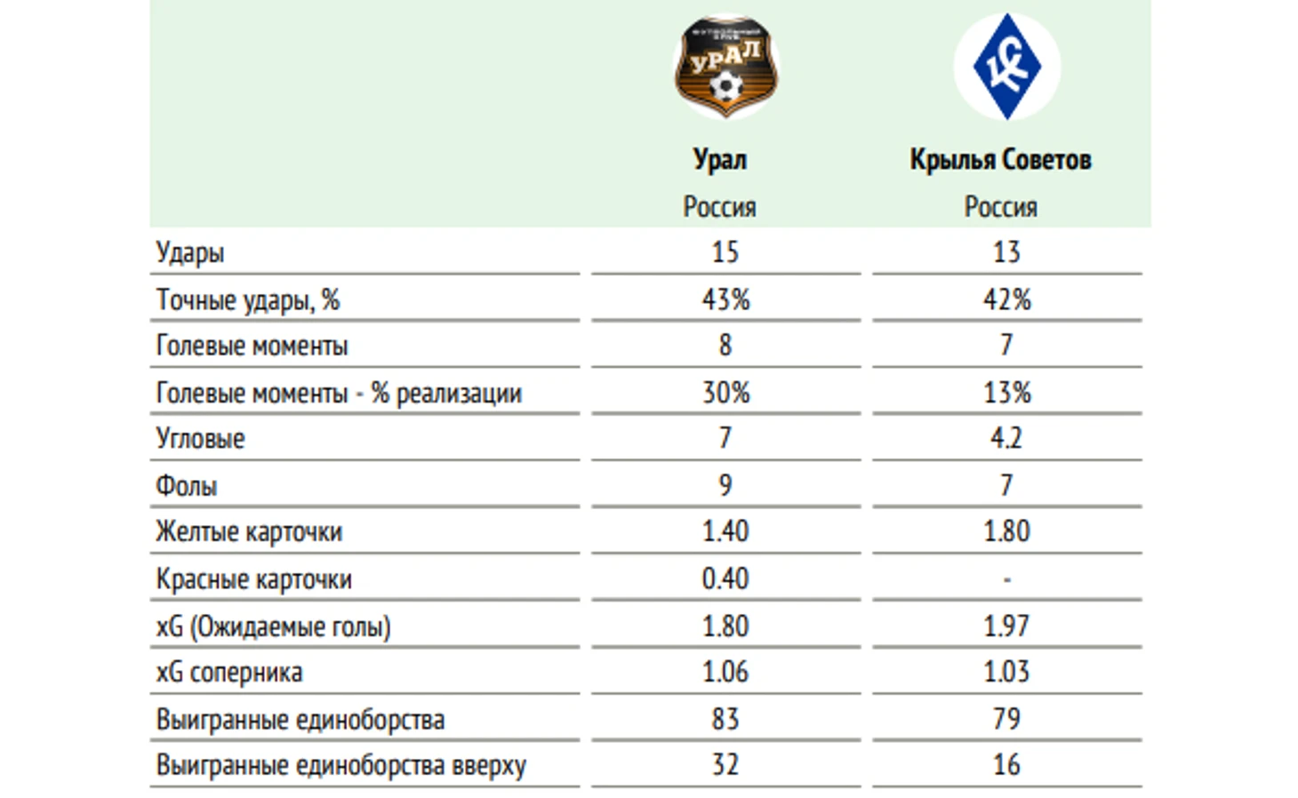🕮 Факты: ◉ «Урал» уже восемь матчей не может выиграть у «Крыльев Советов» на своём поле. Пять из этих матчей завершились вничью, причём четыре – со счётом 1:1. В последний раз екатеринбуржцы выигрывали дома у самарцев 24 апреля 1994 года. ◉ «Урал» восемь туров не играет вничью. ◉ На своём поле «Урал» не играет 12 матчей. ◉ «Урал» забивает шесть туров подряд. ◉ «Урал» пока ещё не получал в этом сезоне право на пенальти.