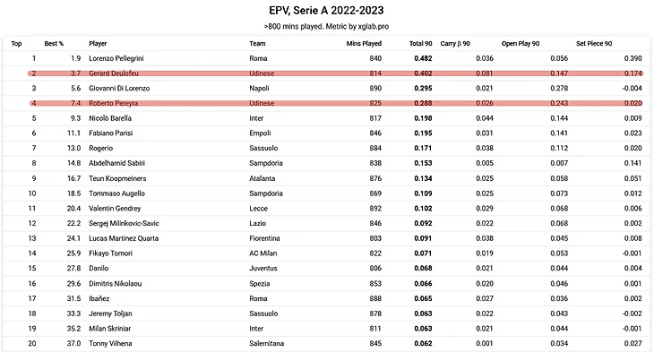 Делофеу и Перейра заслуживают отдельного упоминания, потому что именно эти двое отвечают за креативный потенциал в атаке «Удинезе». Не удивительно, что они занимают 2-е и 3-е места соответственно в таблице лучших ассистентов лиги. Портал xglab.pro показывает, что футболисты входят в топ-4 игроков Серии А по продвижению мяча к воротам.