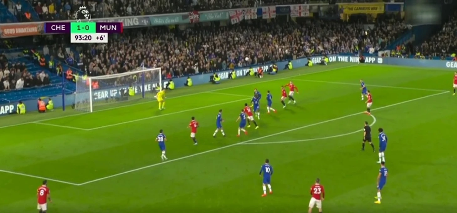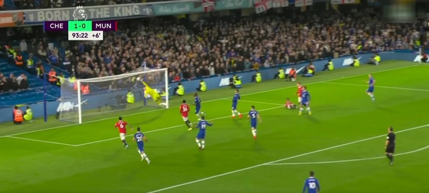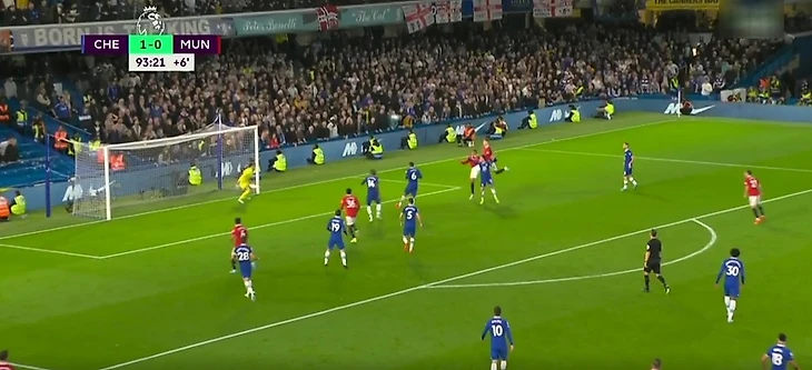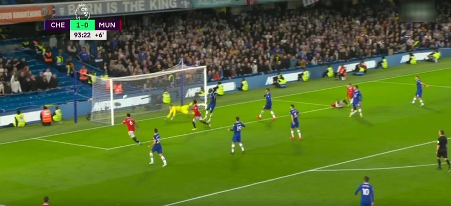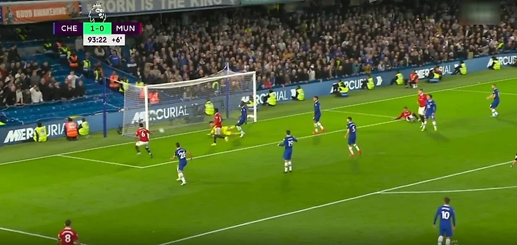 На 94-й минуте, когда «Челси» вел со счетом 1:0, Люу Шоу навесом отправил мяч в штрафную, где стояли Каземиро и Мактомини. Они оба выпрыгнули, и Казе головой отправил мяч под перекладину. Однако Кепа успел отреагировать.