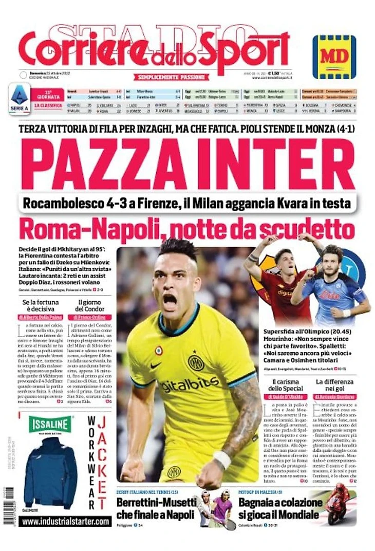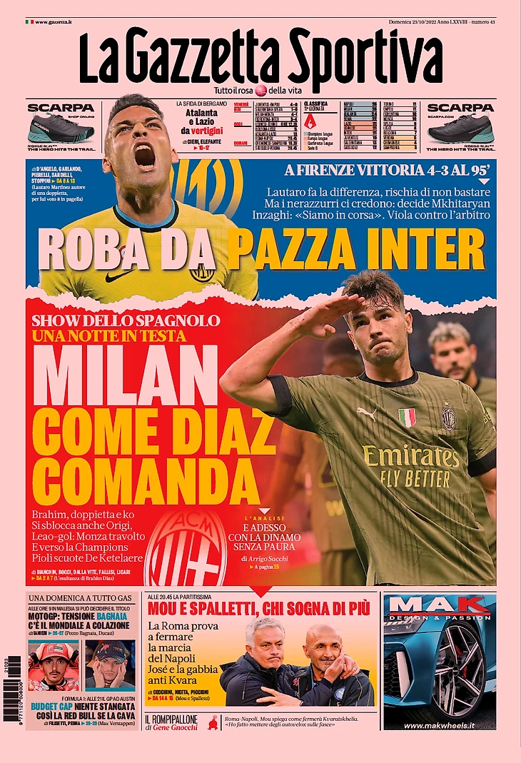 Третья победа подряд для Индзаги, но с каким трудом. Пиоли остановил «Монцу» (4:1). Головокружительные 4:3 во Флоренции, «Милан» догнал Квару на вершине. Всё решил гол Мхитаряна на 95 минуте: «Фиорентина» спорила с арбитром из-за фола Джеко на Миленковиче. Итальяно: «Наказаны очередной невнимательностью». Лаутаро очаровывает: 2 гола и ассист. Дубль Диаса, Россонери летят.