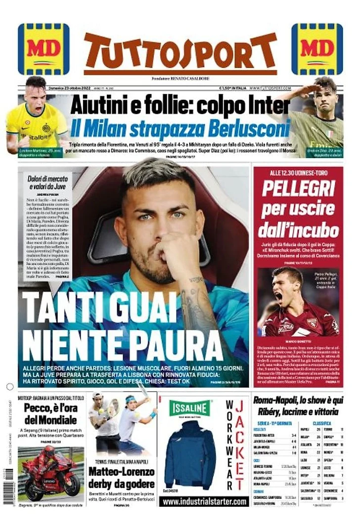 Аллегри теряет также Паредеса: мышечное растяжение, он выбыл по меньшей мере на 15 дней. Но «Юве» готовит выезд в Лиссабон с продлённой уверенностью: они вновь нашли дух, игру, голы и оборону. Кьеза: тесты в порядке.