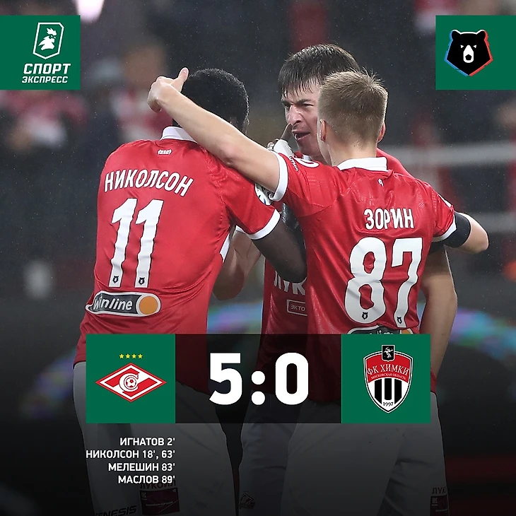 «Спартак» дома обыграл «Химки» в матче 14-го тура РПЛ. Встреча завершилась со счетом 5:0.
