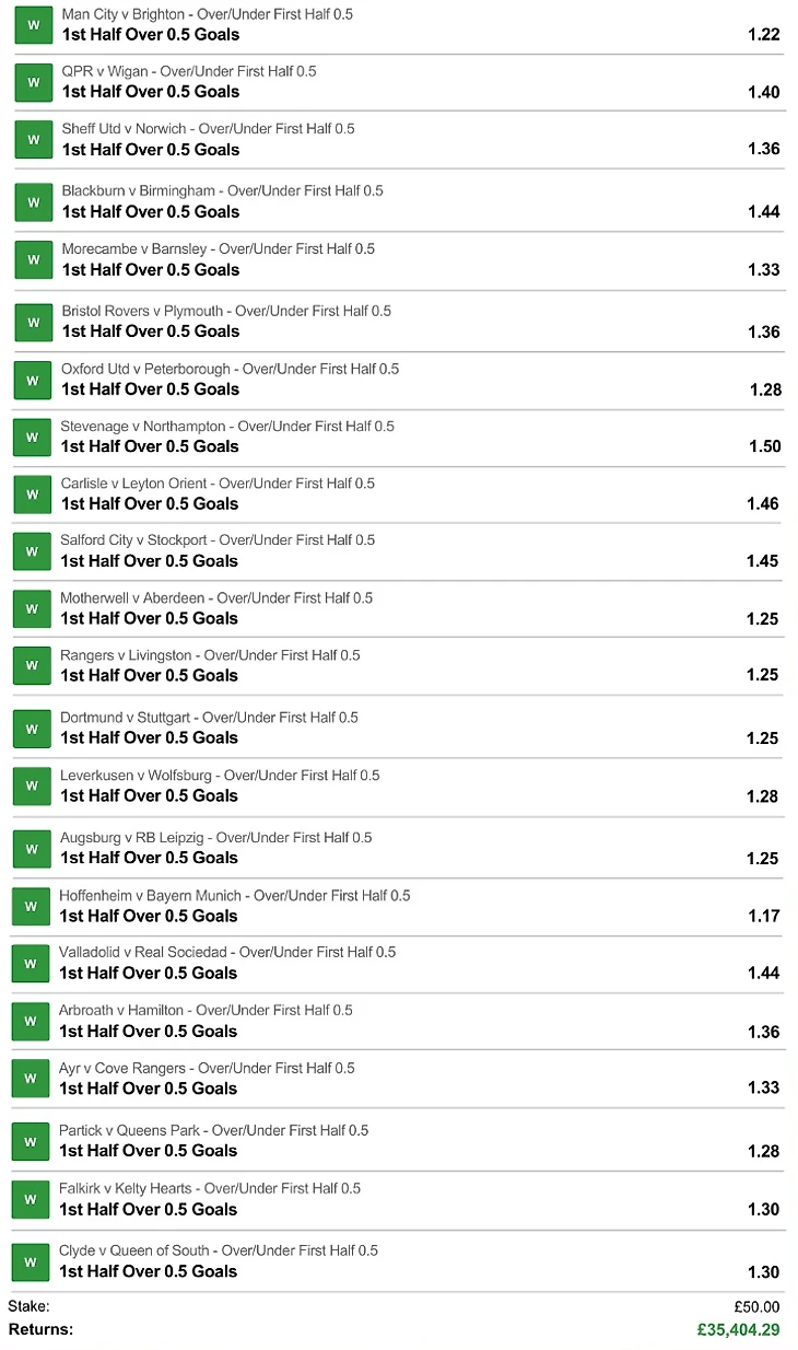 Парень выбрал 23 матча и поставил на тотал больше 0,5 в первом тайме всех игр. Другими словами, фанат понадеялся, что во всех встречах забьют как минимум один гол в первые 45 минут.