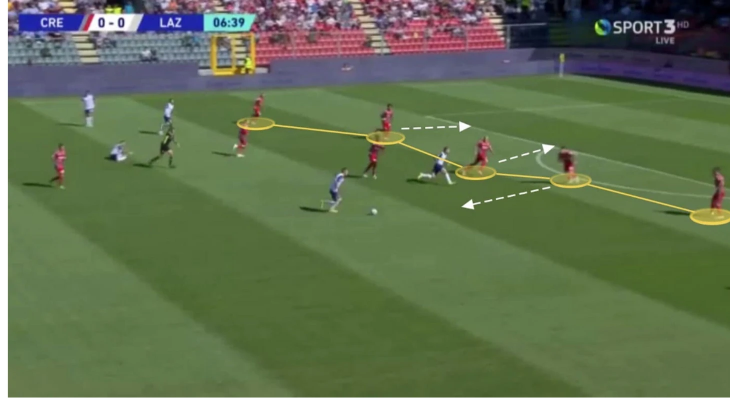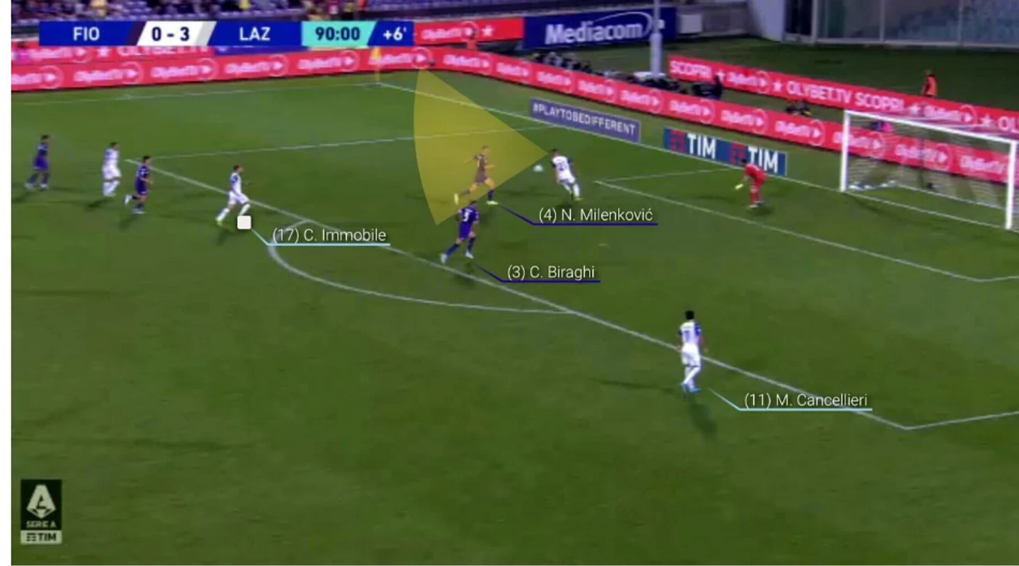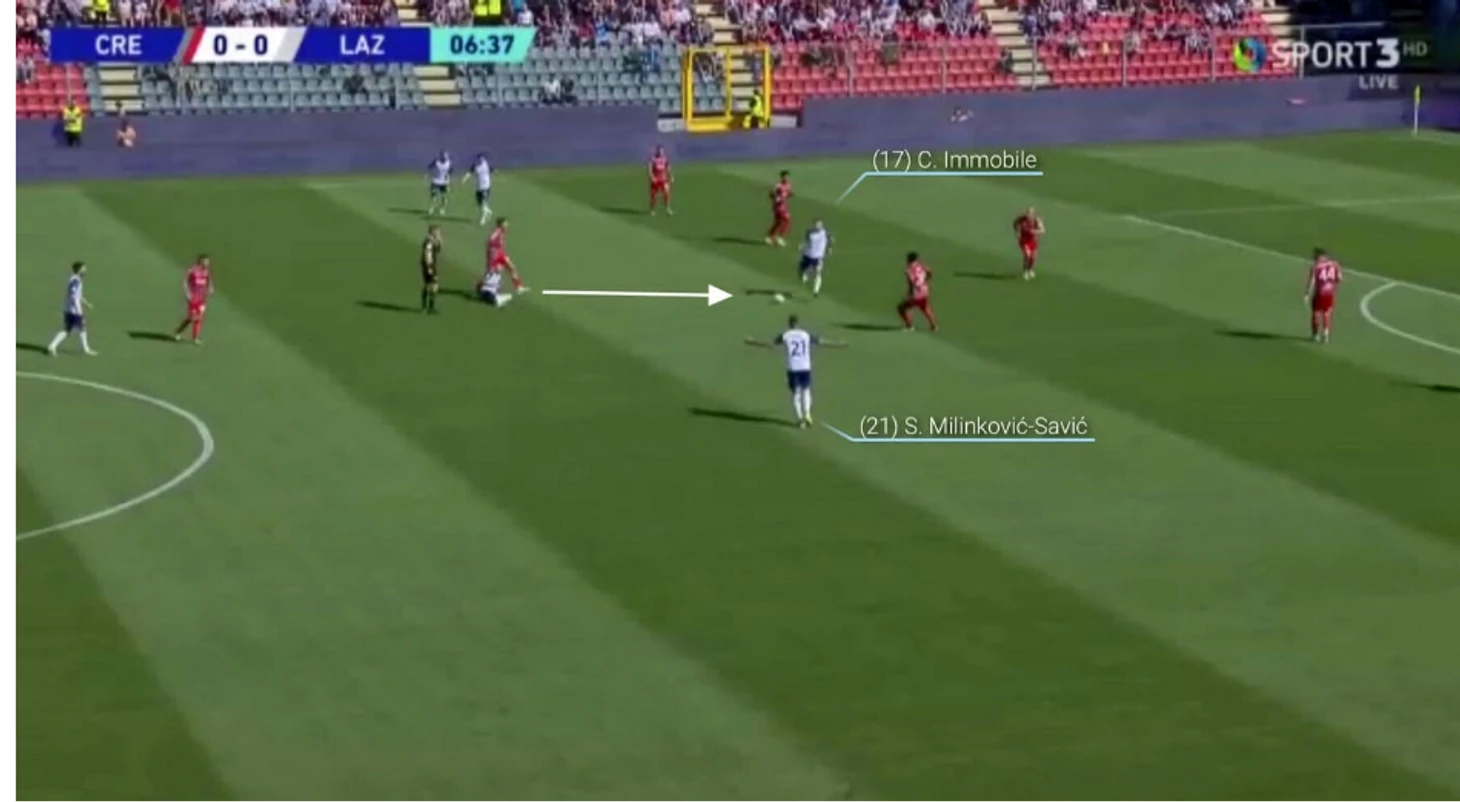 Чтобы разрушить линию "Кремонезе" из пяти человек, Милинковичу-Савичу достаточно совершить небольшой жест: он делает вид, что готовится пробить. При этом один защитник выходит из линии, чтобы помешать ему, оставляя одного из своих товарищей по команде — Кальдиролу — с Иммобиле за спиной и свободным пространством в зоне 14.