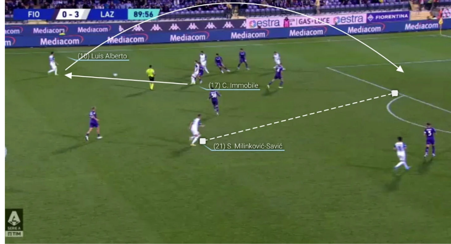 Его движение и пас Луиса Альберто напоминают гол, который он забил в декабре 2019 года против "Ювентуса", с превосходным длинным пасом испанца и завораживающим контролем мяча от серба. Войдя в штрафную, Милинкович-Савич контролирует мяч, стоя спиной к воротам. Возможно, он ожидал, что вратарь покинет линию, возможно, он уже заметил Иммобиле, который, передав мяч Луису Альберто, побежал атаковать пространство, которое серб оставил свободным.