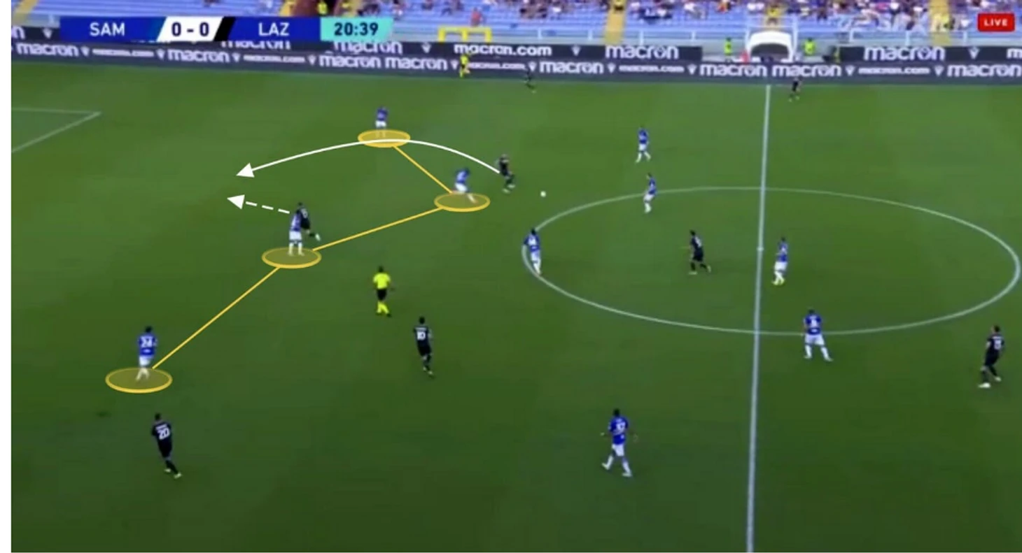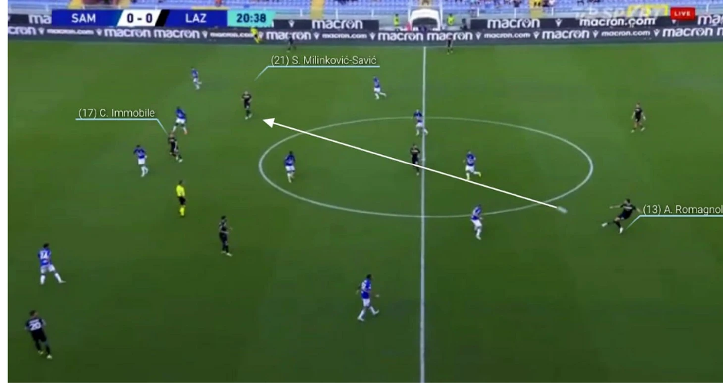 Милинкович-Савич имеет преимущество за счет своей способности привлекать защитников — в данном случае Колли — и затем использовать пространство за их спинами. Синергия с Иммобиле как никогда на высоком уровне: итальянский нападающий меняет положение тела и начинает бежать еще до того, как Милинкович-Савич коснется мяча. Он первым понимает, что собирается делать его партнер по команде, и это дает ему преимущество перед защитой "Сампдории", которая не сможет его остановить.