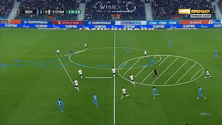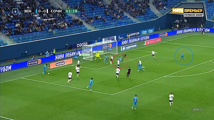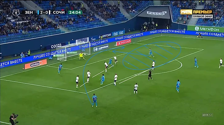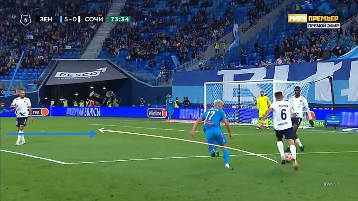 Однако, где было все это в матче с Зенитом? Владение мячом 29% против 57% в среднем по сезону. Всего 3 удара при которых 0 в створ. 43% времени мяч провел на финальной трети поля «Сочи». Зенит катком прошёлся по Сочи. Поговорим немного о том, как «Зенит» забивал свои голы