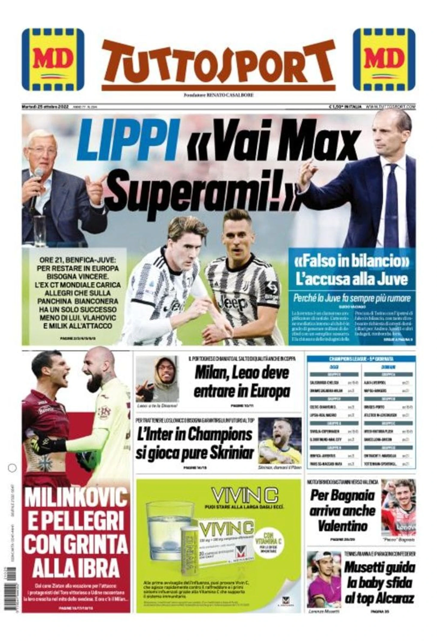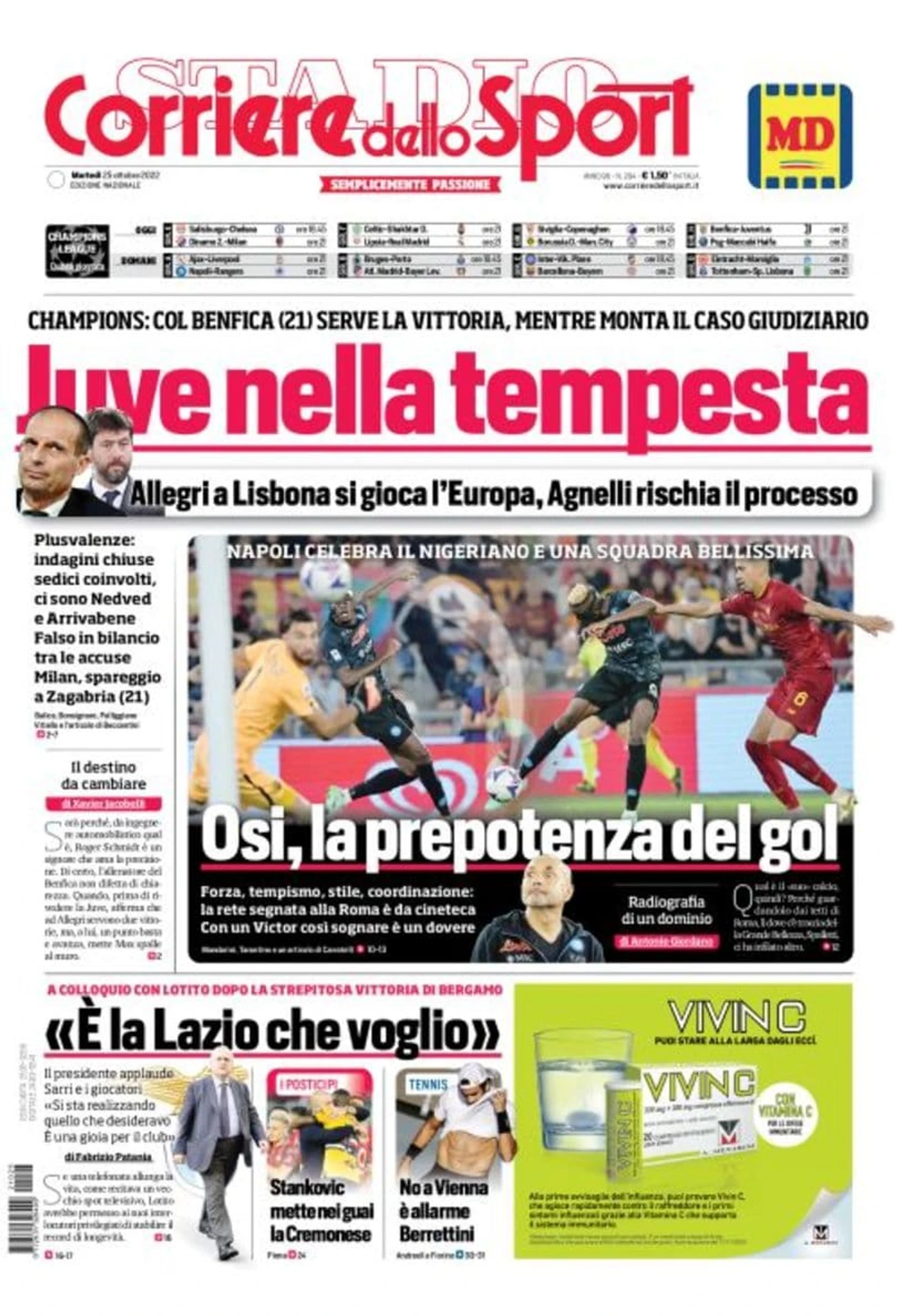Лига Чемпионов: с «Бенфикой» (21:00 СЕТ) необходима победа, в то время как растёт число судебных дел. Аллегри в Лиссабоне играет за Европу, Аньелли рискует судом. Плюсаваленца: закрытое расследование шестнадцати вовлечённых, среди которых Недвед и Арривабене. Подлог в балансе среди обвинений. «Милан», игра на вылет в Загребе (21:00 СЕТ).