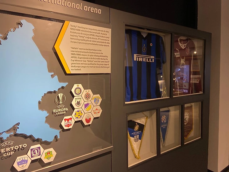 За час до матча турникеты открылись, и после легкого досмотра дружелюбным полицейским логичной для посещения точкой стал фирменный магазин, расположенный в стенах стадиона. Несколько стендов с игровыми футболками, кубок на фоне фотообоев, витрина с брендированными мелочами и старыми программками – это всё пространство, где болельщик и коллекционер может чем-либо поживиться. Около кассы внимание привлекли два квитка, не похожие на матчевые билеты (в Азербайджане один билетный оператор, поэтому игровые тикеты выглядят стандартно, как и на любые развлекательные события). Проходка за два маната открывала доступ в клубный музей: стильная и современная локация из двух залов. Буквально за 15-20 минут можно изучить ключевые факты и личности из клубной истории. Среди экспозиций есть и футболка с вымпелом «Рубина», добытая в розыгрыше Лиги Европы 2012/13. В том матче за бакинский клуб доигрывал знакомый российскому зрителю Игор Митрески.