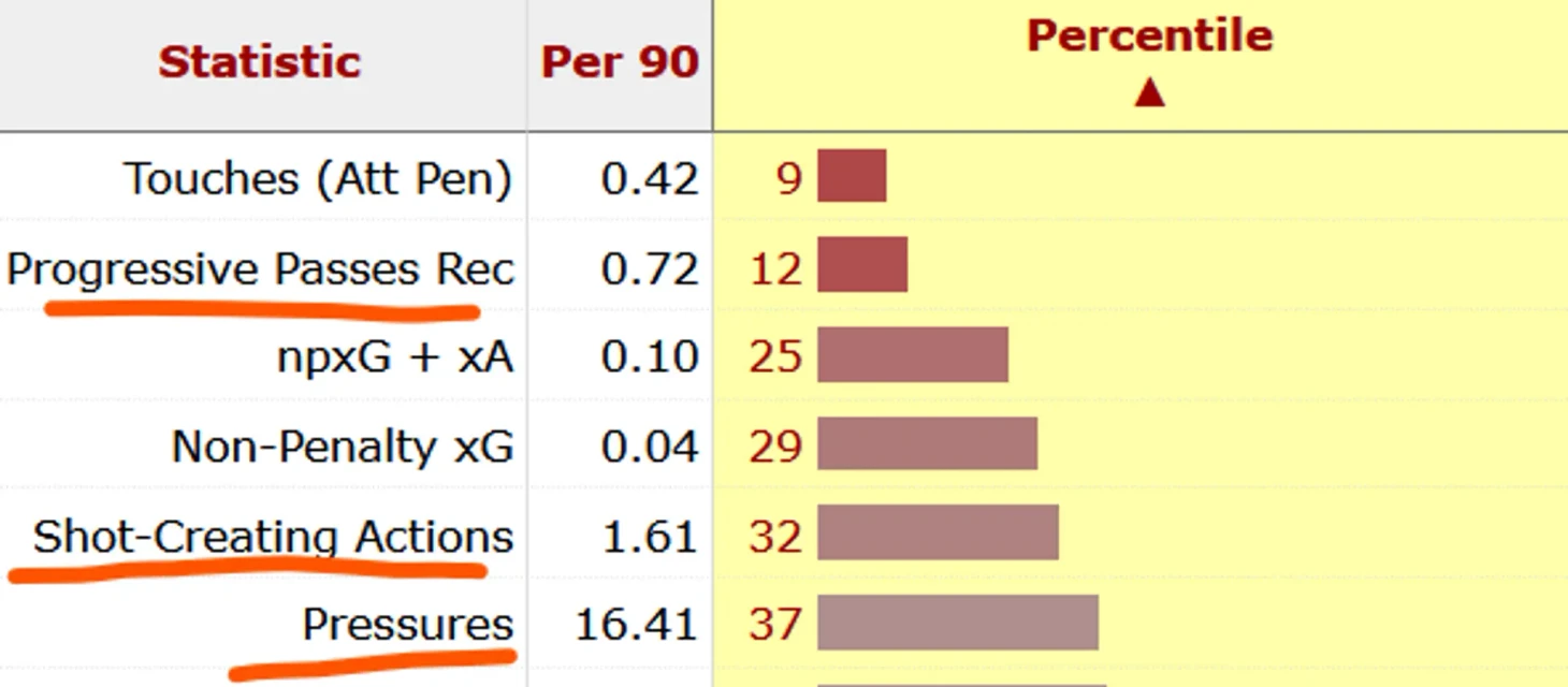 Однако «Барсу», вероятно, смущает его способность созидать – у португальца очень мало предударных действий и продвигающих передач, что крайне важно для Хави. Колонка справа (перцентиль) сравнивает игрока с другими на его позиции, перцентиль равный 12 говорит о том, что футболист лучше только 12% коллег по этому показателю.