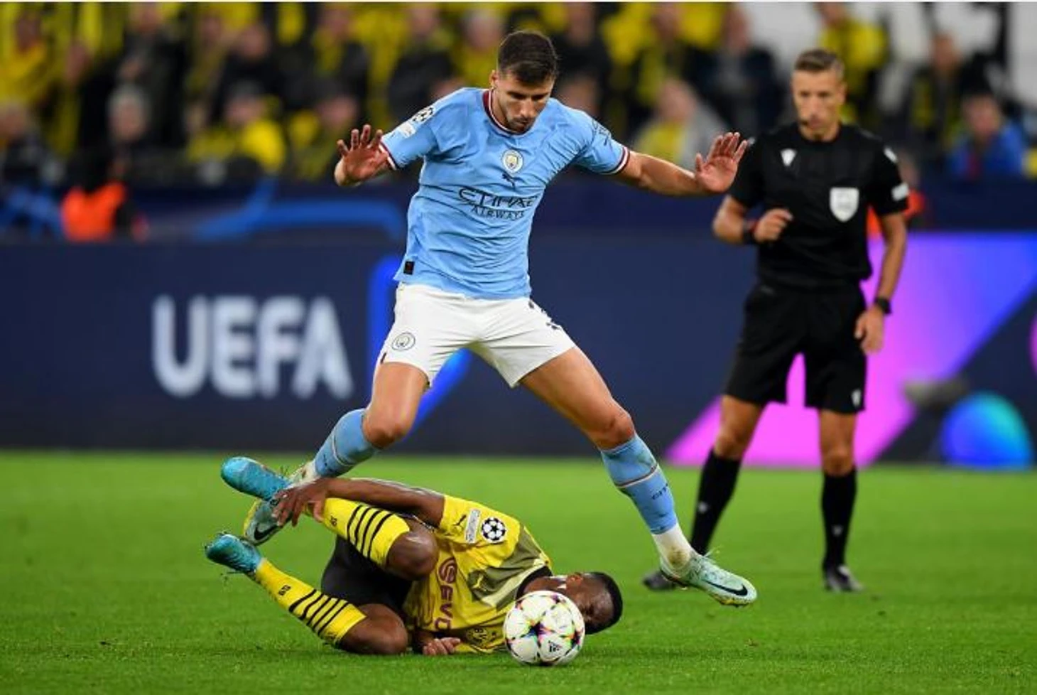 Первый тайм в Дортмунде мало отличался от первого тайма в Манчестере. «Боруссия» встречала соперника в среднем блоке и очень быстро разжималась вперёд. Но качество атакующих действий всё же упало вместе с возрастом — резкие выбегания замедлялись на несколько секунд, удары получались размытыми, а «Сити» успевал вернуться.