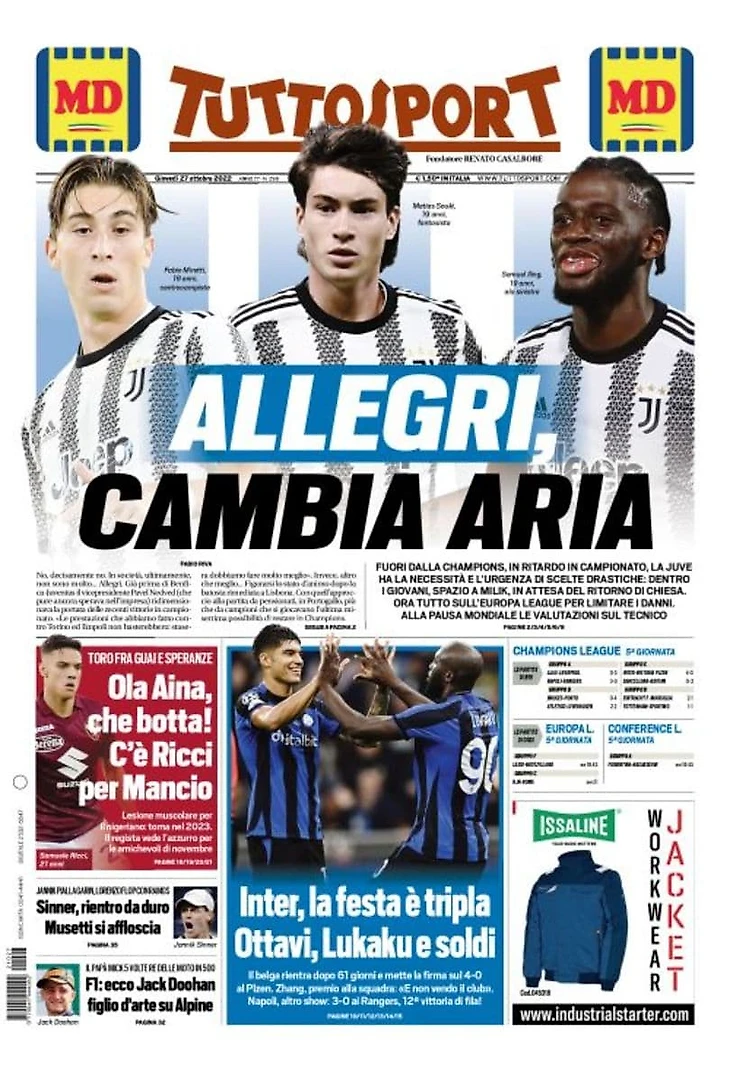 Вылетев из Лиги Чемпионов, отставая в чемпионате, «Юве» имеет необходимость и безотлагательность радикальных выборов: выпустить молодёжь, место для Милика, в ожидании возвращения Кьезы. Теперь всё на Лигу Европы, чтобы ограничить расходы. В паузу на Мундиаль оценка по тренеру.