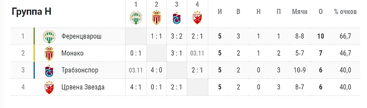 Благодаря сегодняшней ничьей у «Ференцвароша» теперь 10 очков, что означает досрочное первое место, тоже рекорд, и даже, если в последнем туре проиграют в матче с «Трабзонспором», то всё равно отрыва хватит для прохода в стадию 1/8, что опять же является рекордным показателем для клуба в ЛЕ. Конечно, с одной стороны можно сказать, что команде повезло с победой «Црвены Звезды» над турками, но зная стоимость составов, тему везения не хочется поднимать вообще.