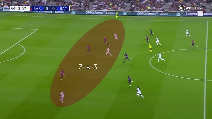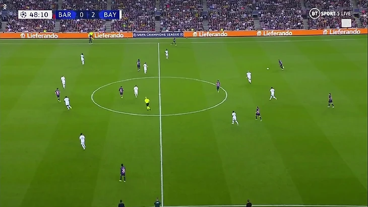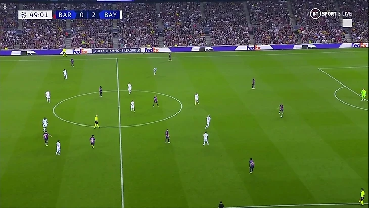 Однако, в результате нескольких отскоков подбор остался за «Баварией», а «Барселона» застряла на чужой половине поля и гости организовывают атаку 3-в-2: