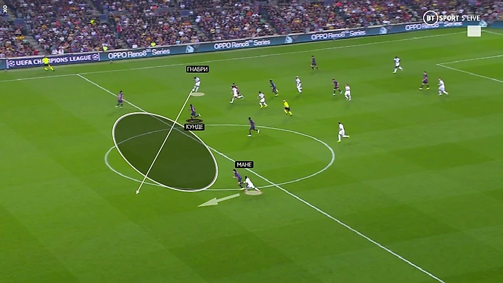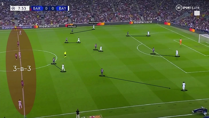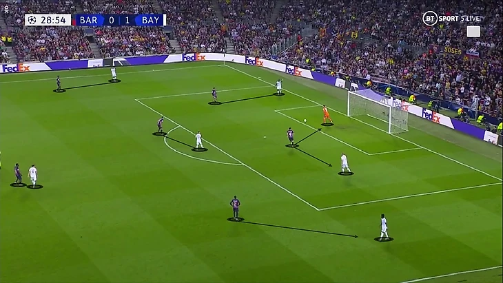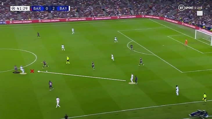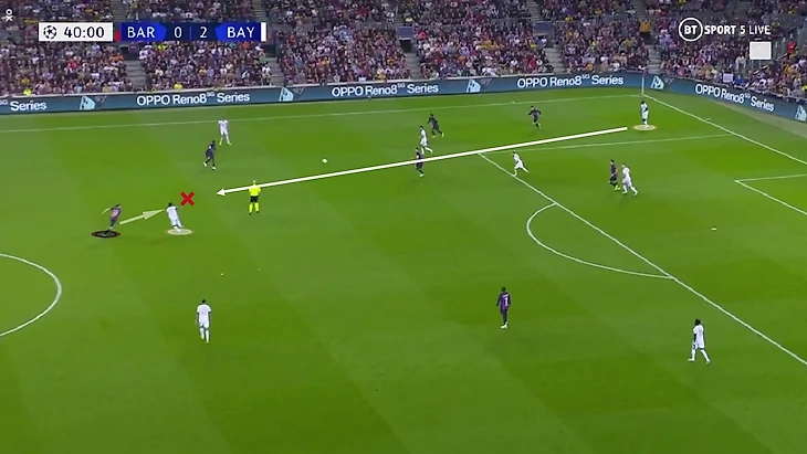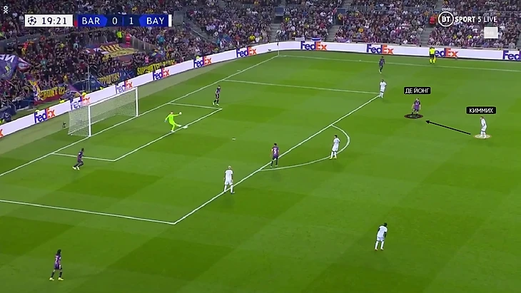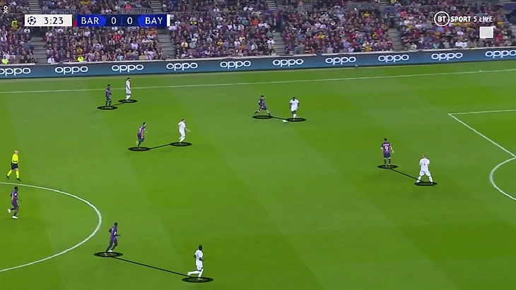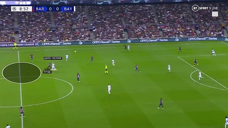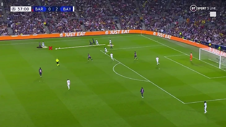 Это очень удобно накладывалось на ситуацию в обороне «Барселоны»: во-первых, смелый персональный прессинг, как уже говорилось ранее, создавал ситуацию 3-в-3 в обороне. Во-вторых, пара центральных защитников Кунде – Алонсо создаёт комфортные условия Шупо-Мотингу для ведения верховой борьбы: у Кунде рост 178 см (против 191 см у камерунца), а Маркос Алонсо, хоть и несильно уступает в антропометрических данных Эрику (189 см), но не имеет должного опыта для игры на позиции центрального защитника. Поэтому, когда нападающий «Баварии» цеплялся за мяч, это приводило к опасным атакам гостей: