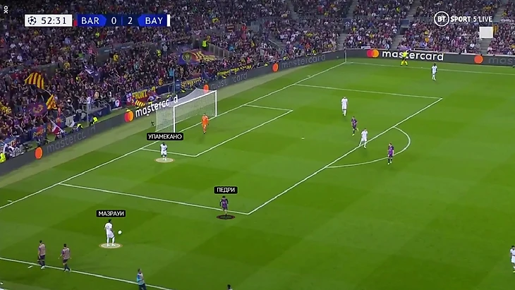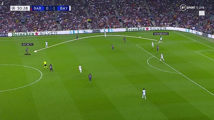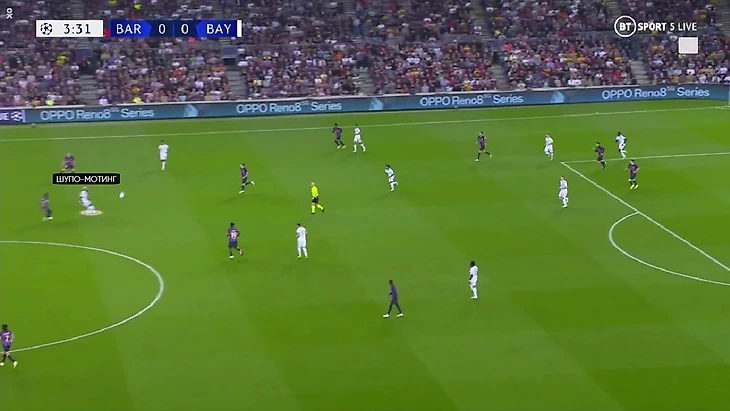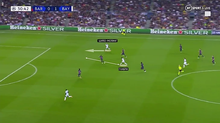 Однако в этот раз у «Баварии» впереди играл габаритный Шупо-Мотинг. Уж не знаю, связано ли его появление в старте с намерением через камерунца проходить прессинг «Барселоны», или же просто Мюллер не набрал форму, но факт остаётся фактом – у гостей появился очевидный адресат для длинных забросов: