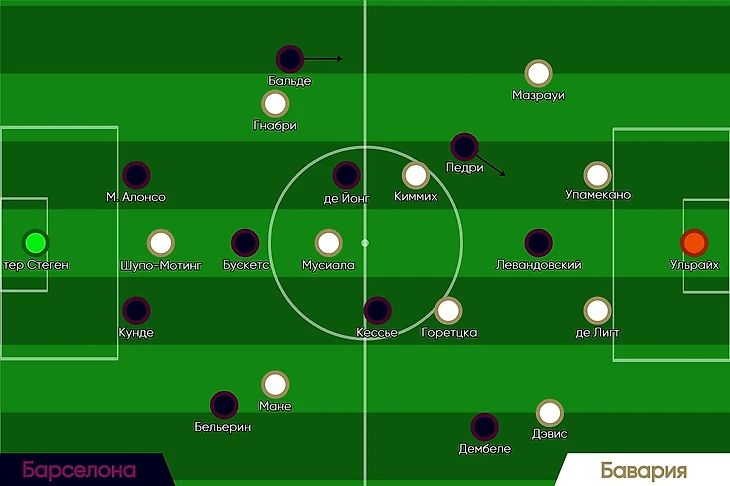 С точки зрения построения игры с мячом Хави повторил тот же план на игру, что и в игре с «Атлетиком» из Бильбао, а именно – выход четырёх полузащитников в старте для того, чтобы лучше справляться с давлением соперника и иметь больше игроков для игры в узких пространствах. В матче с «Баварией» этот план не сработал, причина – Йозуа Киммих. Серджи Бускетса при розыгрышах от ворот закрывают почти все (кроме «автобусных» соперников), и в такие моменты глубже опускался Френки де Йонг. Проблема в том, что Йозуа Киммих очень плотно действовал по Френки, а прессинг «Баварии» от этого становился ещё более эффективным: