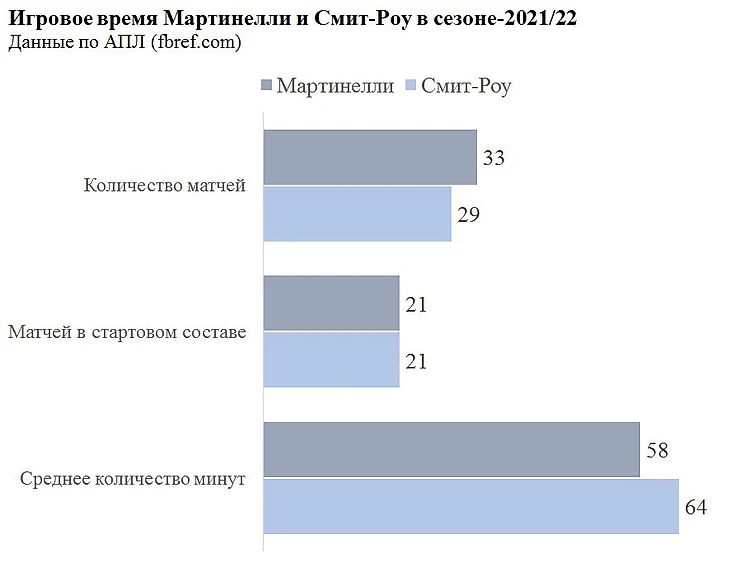 Бразилец выиграл конкуренцию у Смит-Роу, который до травмы успел сыграть лишь 51 минуту в 4-х матчах. В отсутствие англичанина Мартинелли является безальтернативным первым выбором тренера на данную позицию. Иные кандидаты (Маркиньос, Нельсон, Виейра и даже Нкетиа) используются в Лиге Европы и (или) на других позициях.