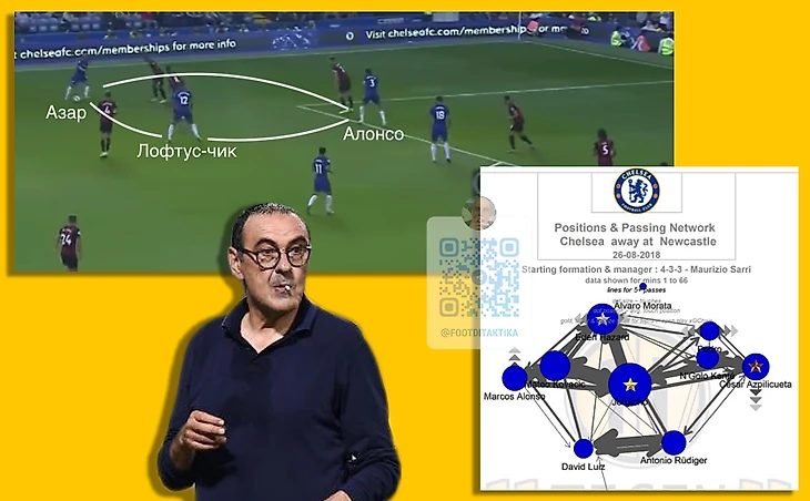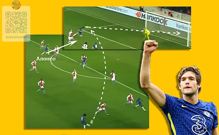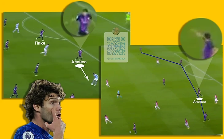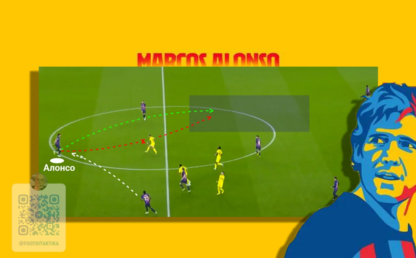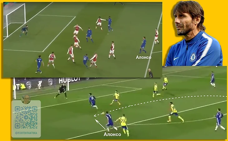 Для новых идей в построении игры как раз отлично подходил герой нашего тактического анализа. Маркос Алонсо занял тогда позицию латераля, которому дали чёткую установку «выжигать бровку». В позиционной защите испанец должен был находиться на последней линии обороны, состоящей из пяти человек, а в позиционном нападении — перегружать последнюю линию уже соперника, образуя ту же пятёрку, но уже впереди.