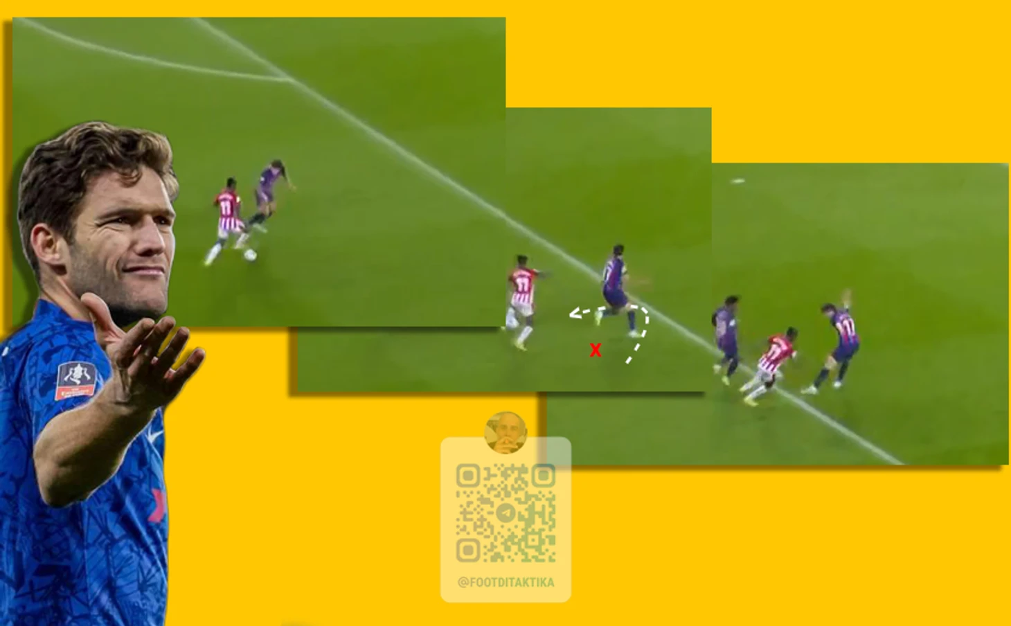Позиционирование корпуса важно не только с мячом, но и, например, в ситуации «один в один»при оборонительных действиях. Так как Алонсо бОльшую часть карьеры провел именно на левой бровке, он привык пласироваться правым плечом к сопернику. Занимая позицию левого центрального защитника, привычный метод сдерживания оппонентов подходитМаркосуи для этой роли. Единственное, в матче против «Атлетика» из Бильбао в дуэли с Нико Вильямсом Алонсо отвернулся от соперника и в определенный момент не видел мяча – это, конечно, грубая ошибка для защитника. Правда, в той ситуации благодаря длинным ногам испанскийзащитник не допустил удар по воротам.