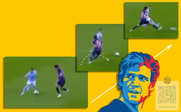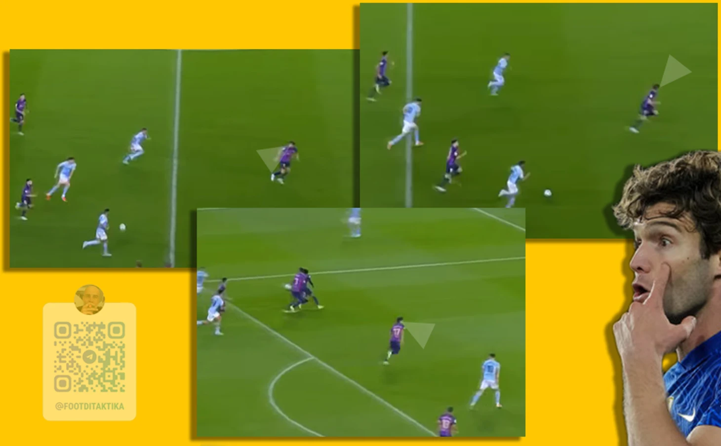 Второй плюс левши — это смена направления атаки первым же касанием. На следующей визуализации Жорди Альба отдает передачу назад, чтобы развернуть атаку. В такой ситуации очень важно расстаться с мячом без промедления, потому что при горизонтальном смещении оборонительных построений, могут образоваться коридоры или же пространства на фланге. В приведенном примере развернуть атаку быстрее всего получится именно в касание и именно левой ногой, что и сделает Маркос.