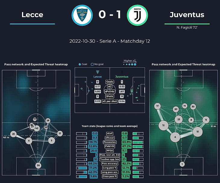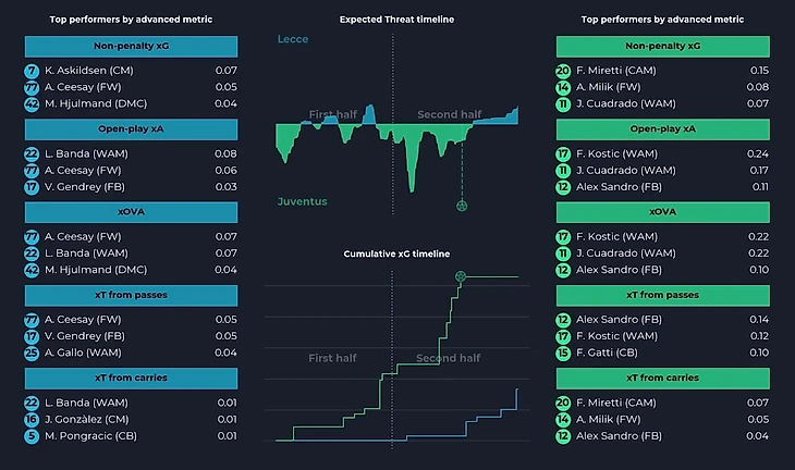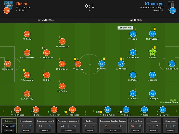 Обратим внимание на территориальное преимущество команды: Ювентус вжал Лечче в штрафную и властвовал на 67,2% поля. Это впечатляет, но не удивляет - Лечче зачастую именно так и играет, предпочитая контратаковать. Об этом нам говорит и владение 64% на 36%. Ювентус забрал мяч, а Лечче попросту не сопротивлялся. И это был разумный ход, учитывая что с игры соперник фактически ничего не создавал от слова совсем. Показатель xG в 0,53 у гостей демонстрирует нам пассивность в атаке и попытки забить хотя бы со стандартов.