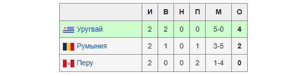Группа С Румыния – Перу – 3:1 Уругвай – Перу – 1:0 Уругвай – Румыния – 4:0
