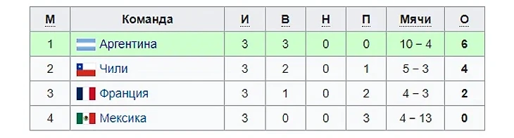 Группа «А» Франция – Мексика – 4:1 Аргентина – Франция – 1:0 Чили – Мексика – 3:0 Чили – Франция – 1:0 Аргентина – Мексика – 6:3 Аргентина – Чили – 3:1
