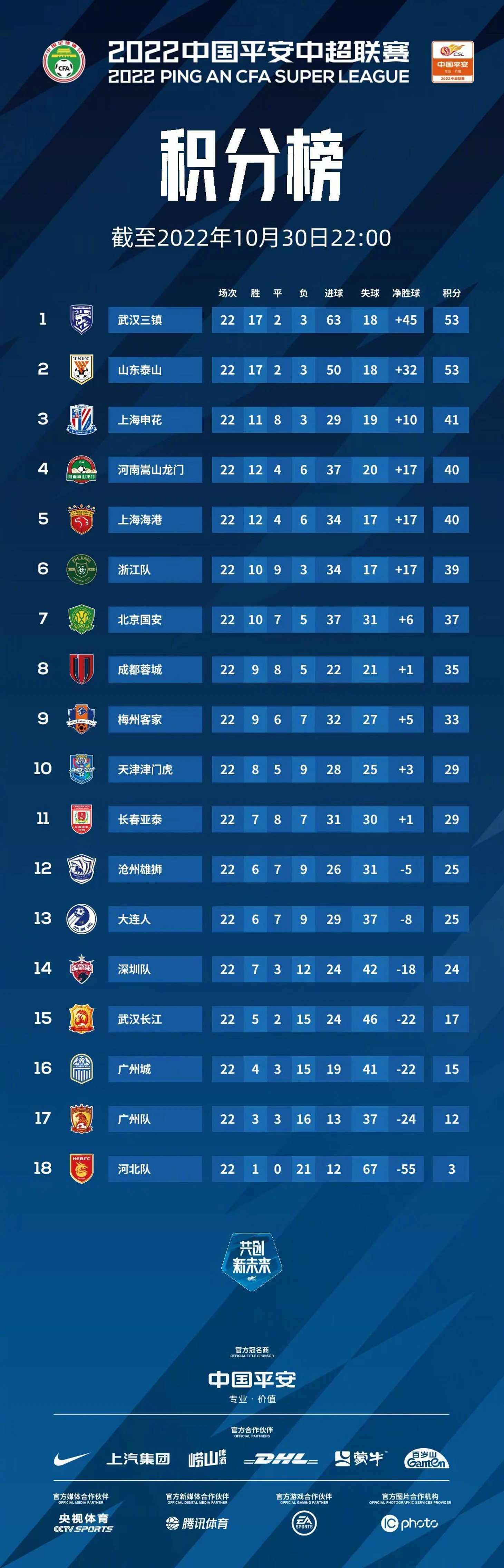 В Китае команды сыграли уже по 22 матча. Осталось всего 14 туров. Борьба за чемпионство обострилась до предела. Шаньдун Тайшань и Ухань Три Таунс набрали одинаковое количество очков, по 53. За третье место имеют шансы побороться довольно большое количество команд. Наиболее явными претендентами на вылет остаются: Хэбэй (3 очка); ФК Гуанчжоу (12); Гуанчжоу Сити (15); Ухань (17). Вылетают 3 команды.