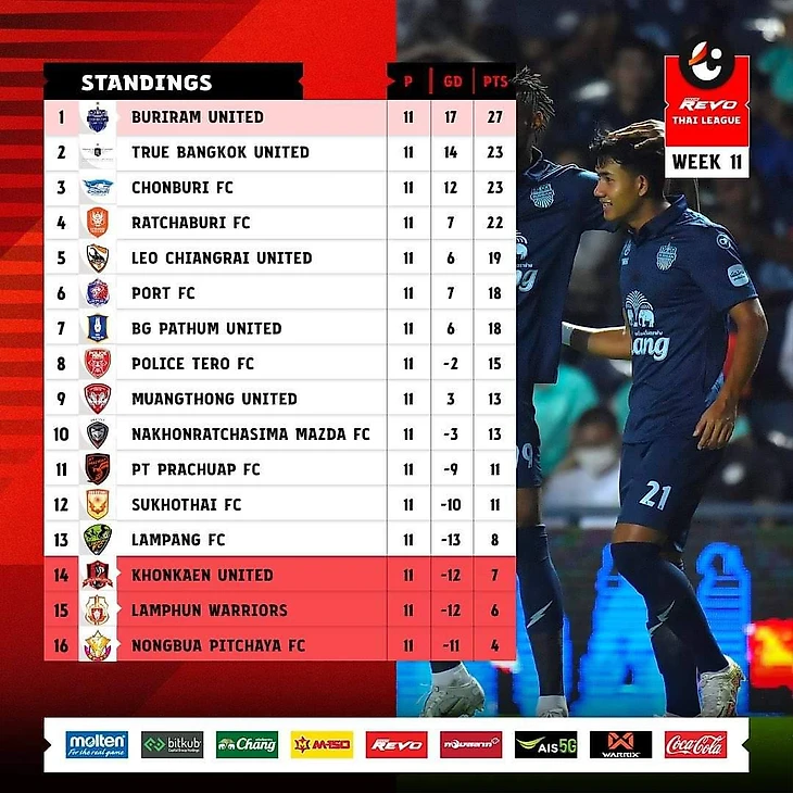 В тайской лиге сыграли всего 11 туров, до конца чемпионата еще далеко. Однако прошлогодний чемпион Бурирам уже оторвался на 4 очка от Бангкок Юнайтед, обыграв последних в очном матче в минувшее воскресенье. Очевидным аутсайдером выглядит Нонгбуа, набравший всего 4 очка.