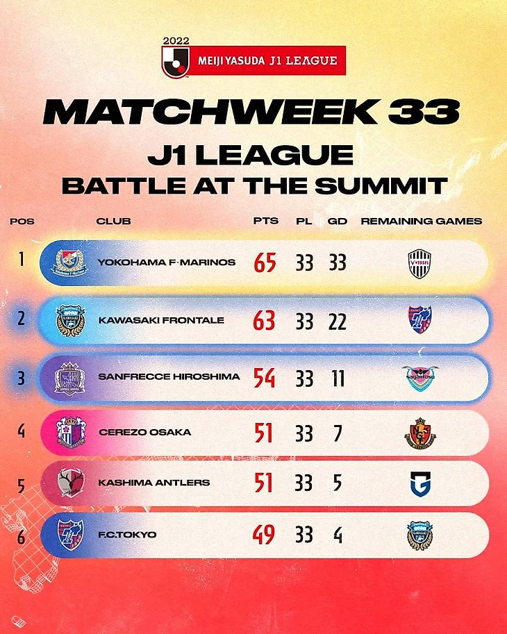 В Японии завершился 37-й тур. Предпоследний. Очень важные матчи были сыграны. Кавасаки дома обыграл Кобе (2-1), а Йокогама Ф Маринос разгромила Ураву (4-1). Маринос пока на 2 очка опережает Кавасаки, так что судьба чемпионства решится в последнем туре. Борьба за третье место тоже продолжается. Чисто в теории, если Хиросима проигрывает, а Сересо выигрывает и ликвидирует разницу -4, тогда могут занять третье место. Еще может побороться Касима, у них тоже 41 очко. В зоне вылета дела обстоят следующим образом. Ивата точно вылетает. Вылететь напрямую еще могут Симизу (33 очка), Киото (35) и Гамба (36). В стыки попадает еще одна команда. И тут в борьбу еще вклинивается Фукуока (37) и Сеннан (38).