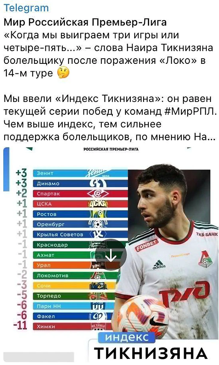 В соцсетях РПЛ опубликовали «индекс Тикнизяна» – он показывает текущую серию побед у команд и чем выше сам индекс, тем сильнее поддержка болельщиков. Естественно, только по мнению Наира.