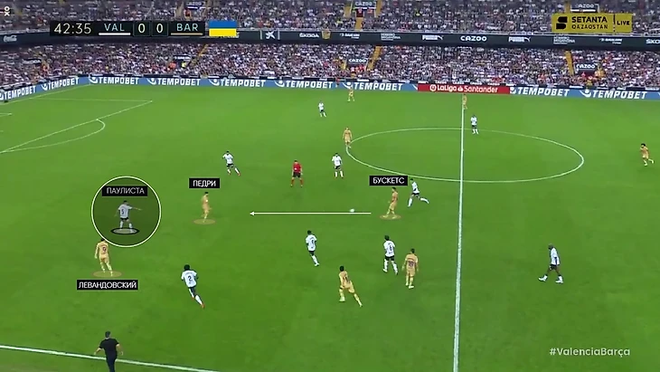 Пример такой ситуации: Левандовский, как он часто это любит, оказывается слева и Паулиста, который должен играть с поляком, сигнализирует партнёру, что сейчас Педри получит пас и время для принятия решения: