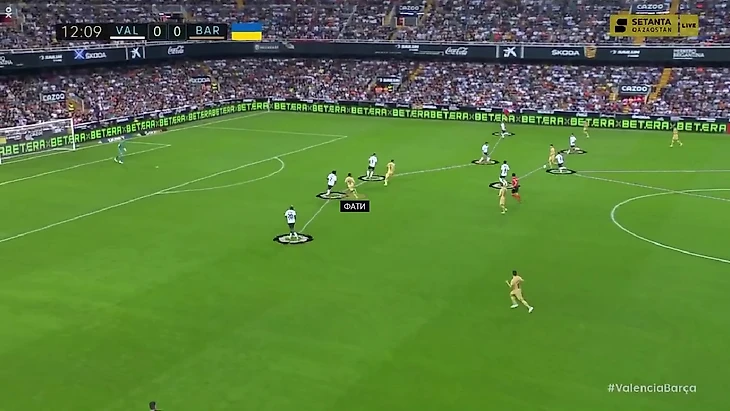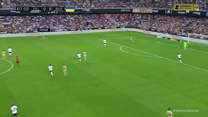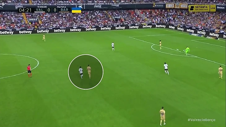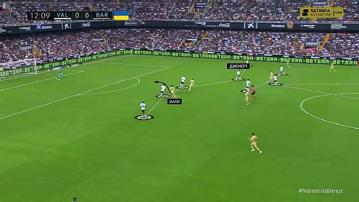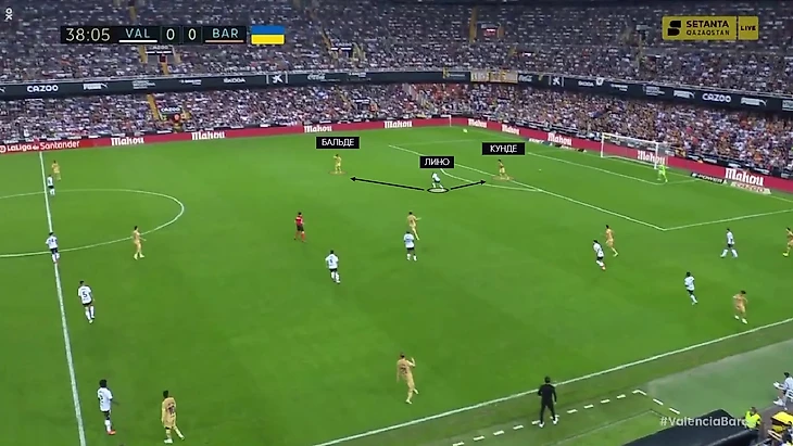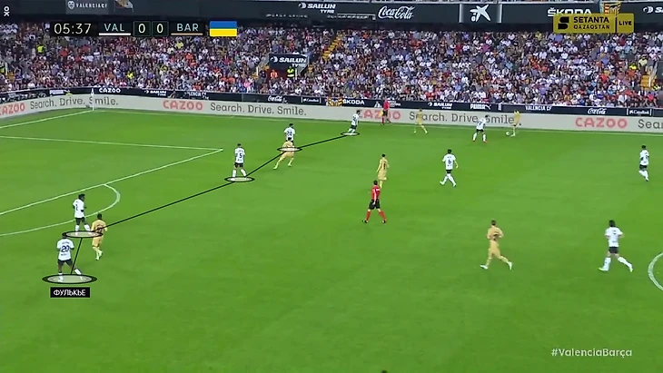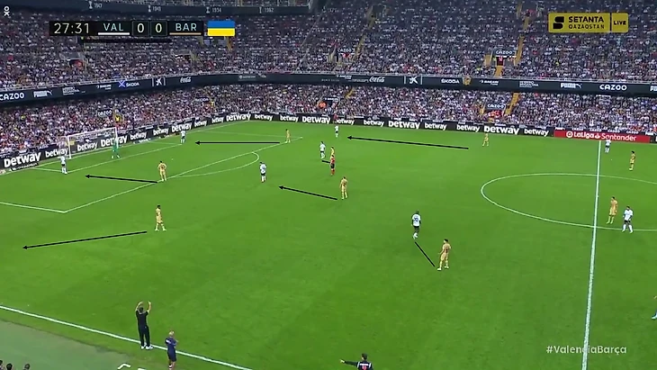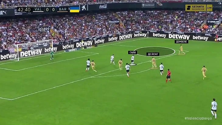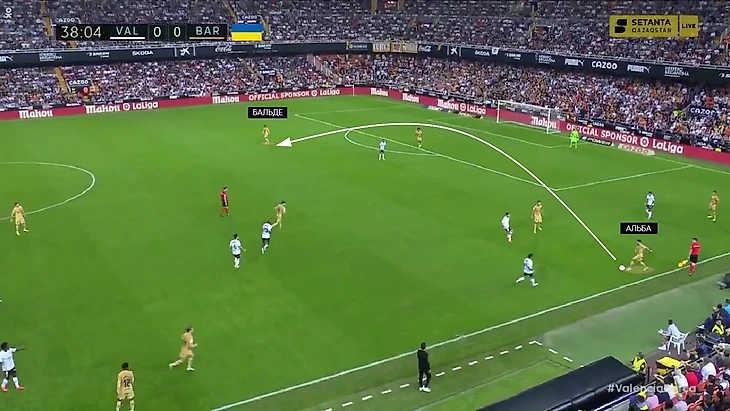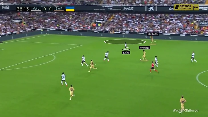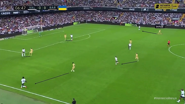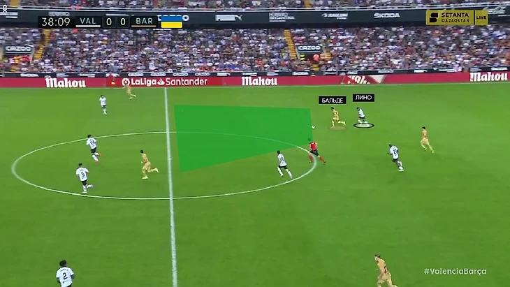 Ситуация: «Валенсия» всё так же прессингует, создавая интенсивность в зоне мяча – в этой зоне у всех прямой оппонент, а на дальнем фланге свободный Бальде: