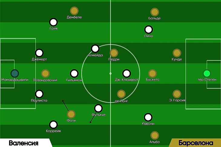 В 12-м туре испанской Примеры на «Месталье» в гости к местной «Валенсии» приезжала «Барселона». У хозяев к началу встречи сложное турнирное положение: только 1 победа в последних пяти матчах чемпионата и 10-е место. Команда явно недобирает очков – с показателем 20,33 по системе ожидаемых очков (xPts) «Валенсия» находится на 4-5 месте (примерно такой же показатель у «Сосьедада»). Ну а с турнирным положением «Барселоны» и так всё понятно – три очка отставания от «Мадрида», а Ла Лига – единственный оставшийся значимый турнир у «каталонцев» в этом сезоне. Очки терять нельзя. Матч получился хоть и небогатым на голы, но довольно интересным с точки зрения борьбы, скорости и предложенных идей на поле. «Барселона» вырвала победу на третьей компенсированной минуте, а после матча была жаркая дискуссия по поводу заслуженности такого результата. Давайте это выясним!