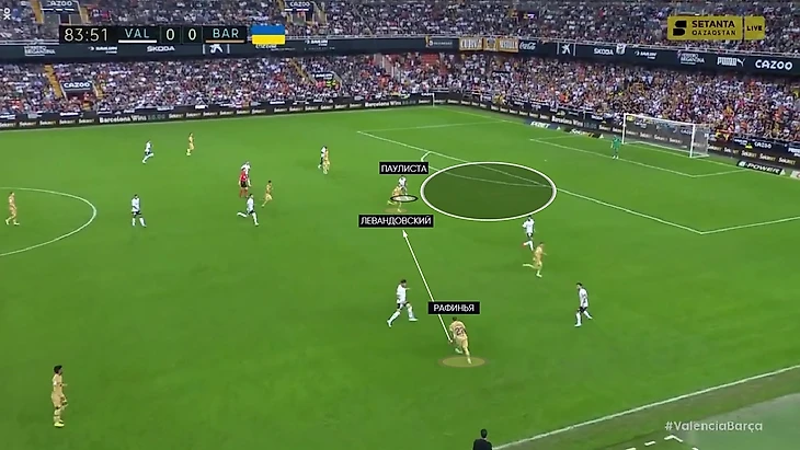 Например, бразилец поучаствовал в эпизоде с гениальным ударом Феррана Торреса. Рафинья получает пас на правом фланге, Гави идёт открываться направо и уводит Джёмерта за собой, и бразилец даёт пас на Левандовского, за которым пошёл Паулиста: