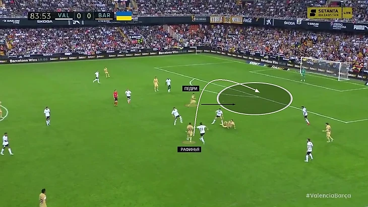 И вроде бы Паулиста делал всё правильно и он не позволил Левандовскому обработать мяч, но тот всё равно отскочил к Рафинье. А дальше мастер-класс по скорости принятия решения от бразильского вингера: Педри врывается в свободную зону (из-за того, что Паулиста за Левандовским вышёл), а Рафинья в одно касание делает идеальный мягкий заброс на Педри: