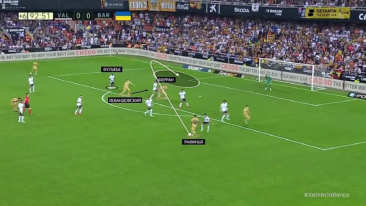 А победный гол Левандовского был забит тоже после великолепного заброса от Рафиньи. Что хочется отметить – роль всё того же Феррана Торреса! Испанец благодаря своему движению увёл за собой Паулисту. С Левандовским должен был играть Димитри Фулькье, но то ли из-за усталости (у него действительно был очень большой объём работы в этом матче), то ли из-за того, что неправильно оценил эпизод и подумал, что Паулиста всё контролирует, француз недоработал за Левандовским:
