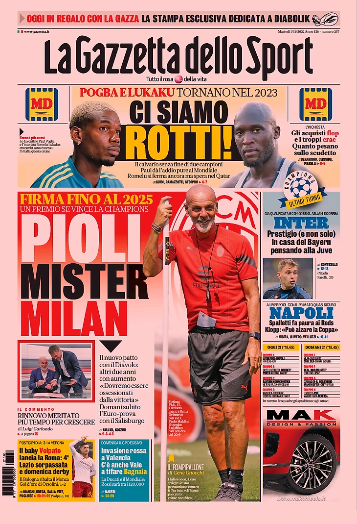 Пиоли, мистер «Милан». Заголовки Gazzetta, TuttoSport и Corriere за 1 ноября